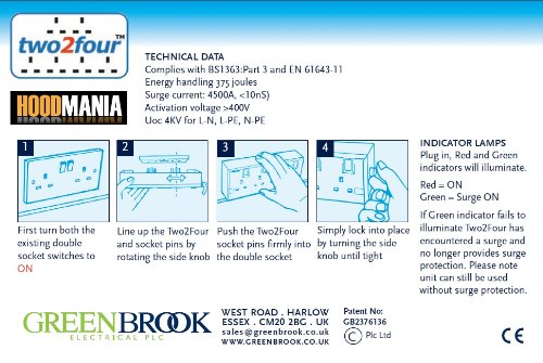 Four gang surge protected socket converter Retrofit plug in wiring accessories. Surge protected, ideal for plugging in computers and expensive TV’s and home entertainment systems. Ideal for private or public sector, domestic or commercial applications, ideal for small offices. Two2Four wiring accessories are an ideal retrofit component for existing installations. Allows for any double socket to four gang conversion of standard flush-mounted double socket without the need for additional cabling or chasing. Converts 2 gang into 4 gang switched socket outlets instantaneously without need for tools. All four outlets individually switched. Poly-carbonate construction providing high levels of impact resistance. 13a fuse protected. Quick and easy replacement. When plugged in the red and green indicators will illuminate. RED = On GREEN = Surge protection enabled. NOTE: If the green indicator is not lit, then the unit has encountered a surge and will no longer provide surge protection but will still function as a socket outlet, however, the unit will need to be replaced for further surge protection. If both lamps are off then remove the socket and check the installed 13a fuse before doing anything else. Full detailed installation instructions on the packaging