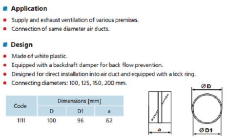 Design Made of white plastic. Equipped with a backdraft damper for back flow prevention. Designed for direct installation into air duct and can be secured with lock ring or or suitable tape such as duct tape or aluminium tape. Connecting diameter: 100 mm.