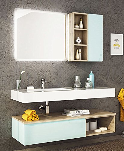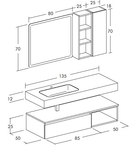 dafnedesign. com – Sky Blue Fir – Mirror and clear “floppy 80” H 70 x L 80 cm Bath Mirror Base container 1 Drawer – H 25 x L 85 cm Storage 1 drawer base – Base A Day H 25 x L 50 cm-top laminate wood soprabase SP. 1.8 x L 135 cm laminated wood countertop th.- Top fabric in politek with bath int SP. 12 L135 cm politek thick hollow top th.- Wall day H 70 x L 25 cm Open wall cupboard – Hanging 100% made in Italy