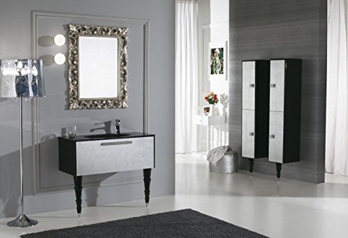 dafnedesign. com Bathroom Cabinet Drawers And Rectangular Mirror – Deco D11 Size: l.99 p.45 cm Finish: Polished Black and Silver Leaf Finish Top: Top in Crystal integrated float black base p/sink 1 Drawer with cm 98.5 feet – top Integrated Crystal – Black – Mirror Deco cm 98 x 76 – Ball Lamp – No. 2 columns 2 doors with foot 133 x 31 x 34 cm – 100% made in Italy