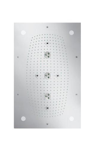 28418000 Hansgrohe Kopfbrause Rainmaker rechteckig chrom mit Licht · Kopfbrausen Duschsystem in rechteckiger Ausführung zur Deckeneinbau-Montage · mit Beleuchtung 4 x 20 Watt Niedervolt Halogen Reflektorlampen, Netzgerät 80 VA · Ansteuerung der Kopfbrause muss über 3 Verbraucher erfolgen, Bedienung über Quattro Vierwegeumstellung oder iControl mobile (elektronisch) empfohlen · Strahleinstellungen: Rain Air – zentrale Kopfbrausenfunktion, Rain Air XXL – vollflächiger, weicher Regen, Whirl Air – 3 rotierende Massagestrahlen sowie 3 Mischkombinationen, TÜV gepüft · alle Strahlen mit Air Technologie · nicht für Durchlauferhitzer geeignet zu ergänzen mit: · Grundkörper für rechteckigen Rainmaker #28414180 empfohlen mit: · HighFlow Thermostat #15715000 · iBox universal #01800180 (nicht im Lieferumfng enthalten) 28418000