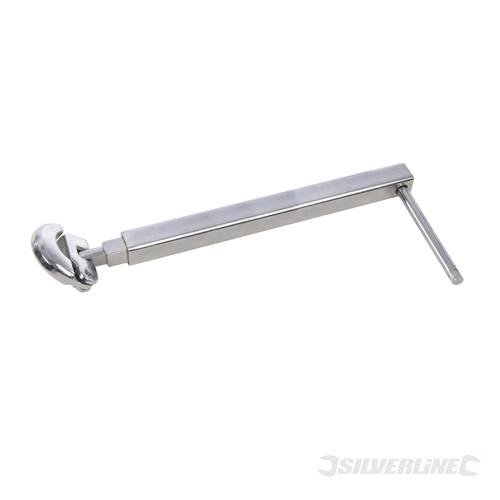 Chrome-plated, spring-loaded steel telescopic basin wrench with self-locating, self-locking hook. Fits 9mm (3/8″) to 32mm (1 1/4″) nuts. Length 278 – 455mm, adjustable in 60mm steps. Pivoted, 4-position adjustable jaw.